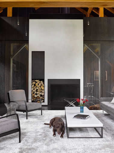 In rural Hillsdale, New York, a weekend retreat near Bald Mountain seamlessly converts a barn structure into contemporary living spaces, marrying rustic exteriors with modern interiors. MM Design Studio crafted captivating entertainment areas for the homeowners who enjoy hosting guests. While maintaining a rustic barn aesthetic externally, the interiors present an expertly layered fusion of elegant and masculine elements, creating distinct focal points. The standout features include a striking open staircase to the sleeping loft, crafted with a sandblasted oak balustrade and walnut treads, and an adjacent den enclosed by a bronze-beaded scrim and intricately carved black stone, featuring a suspended fireplace for intimate gatherings. Furnishings, sourced from the Hudson Valley area, span midcentury modern to Shaker and traditional antiques. The overarching goal was to infuse the living space with sophistication akin to a Manhattan loft, achieved through strategic lighting and distinct zones within the expansive living area. The result is a harmonious blend of rustic charm and contemporary flair, creating a unique environment for homeowners and guests alike.